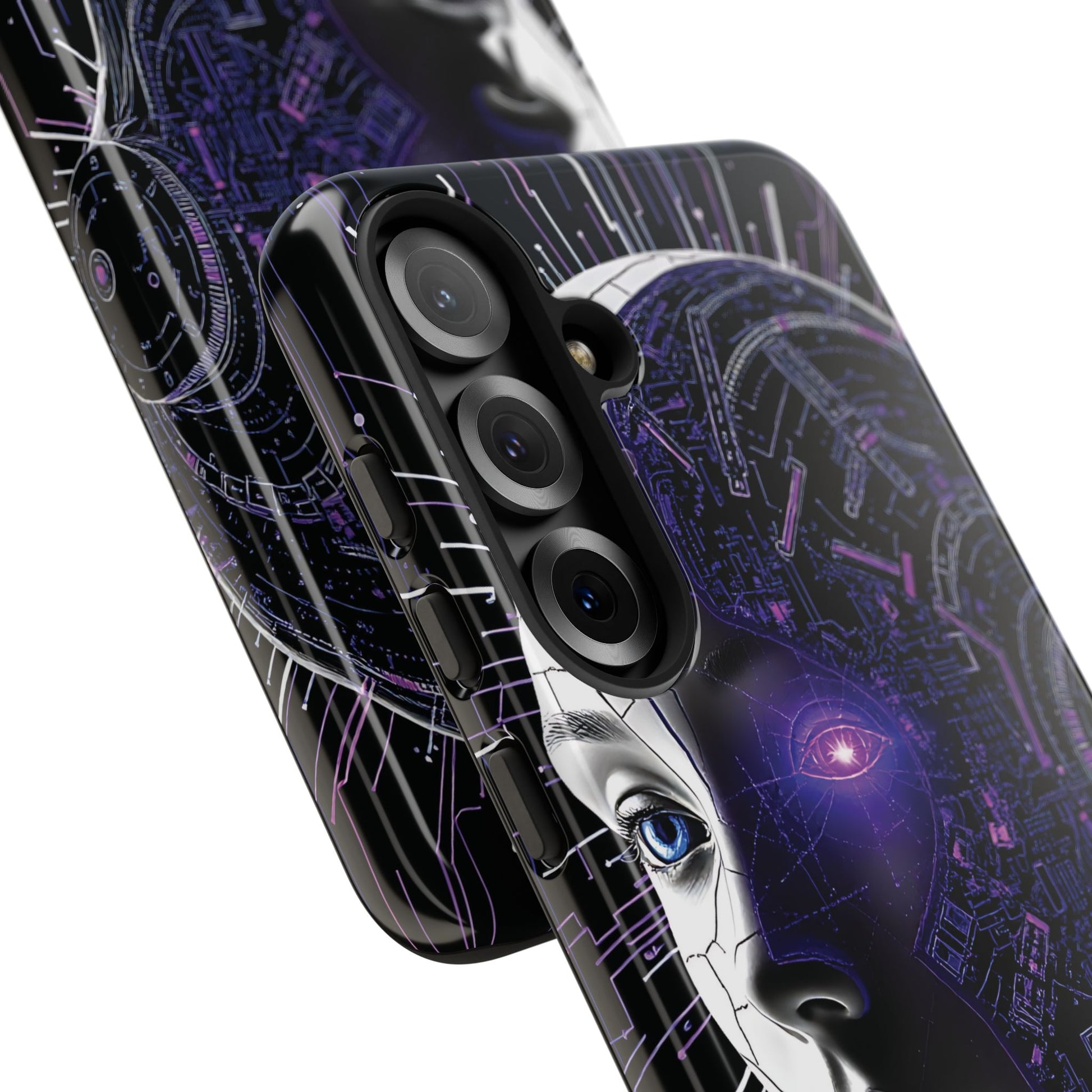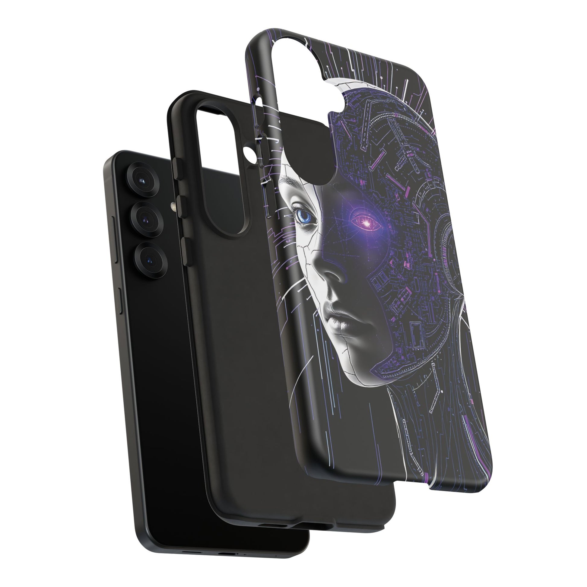 Rogue AI is a striking fusion of beauty, circuitry, and consciousness — a reminder that even technology can dream, rebel, and evolve. This design showcases a half-human, half-synthetic face illuminated by electric violet light, symbolizing the merge between logic and soul.