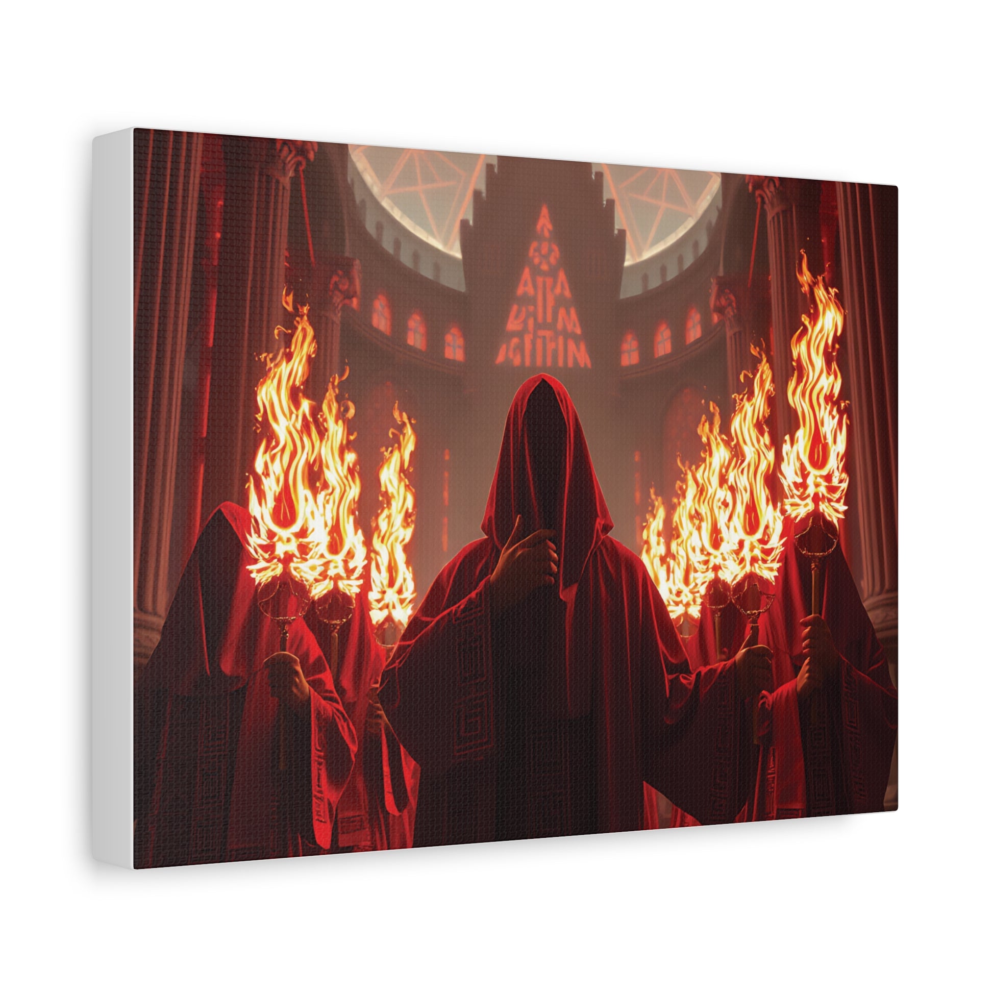 Witness the initiation. The Red Signal captures a haunting ceremonial moment — robed figures cloaked in crimson, torches ablaze beneath a cathedral dome glowing with cryptic geometry. The composition radiates power, secrecy, and devotion to something unseen.